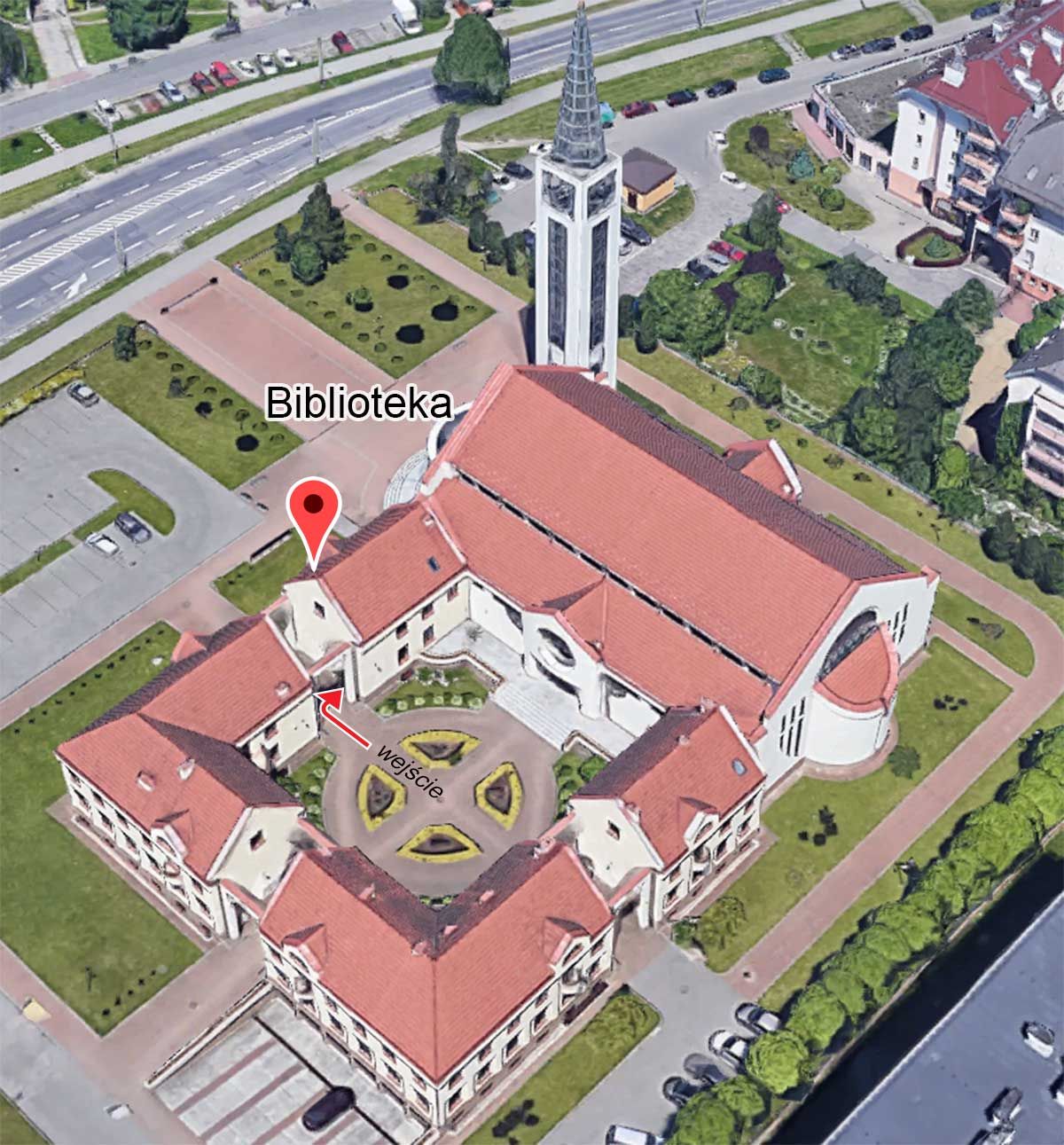 Biblioteka znajduje się w budynku parafialnym na 1 piętrze – nad kaplicą.